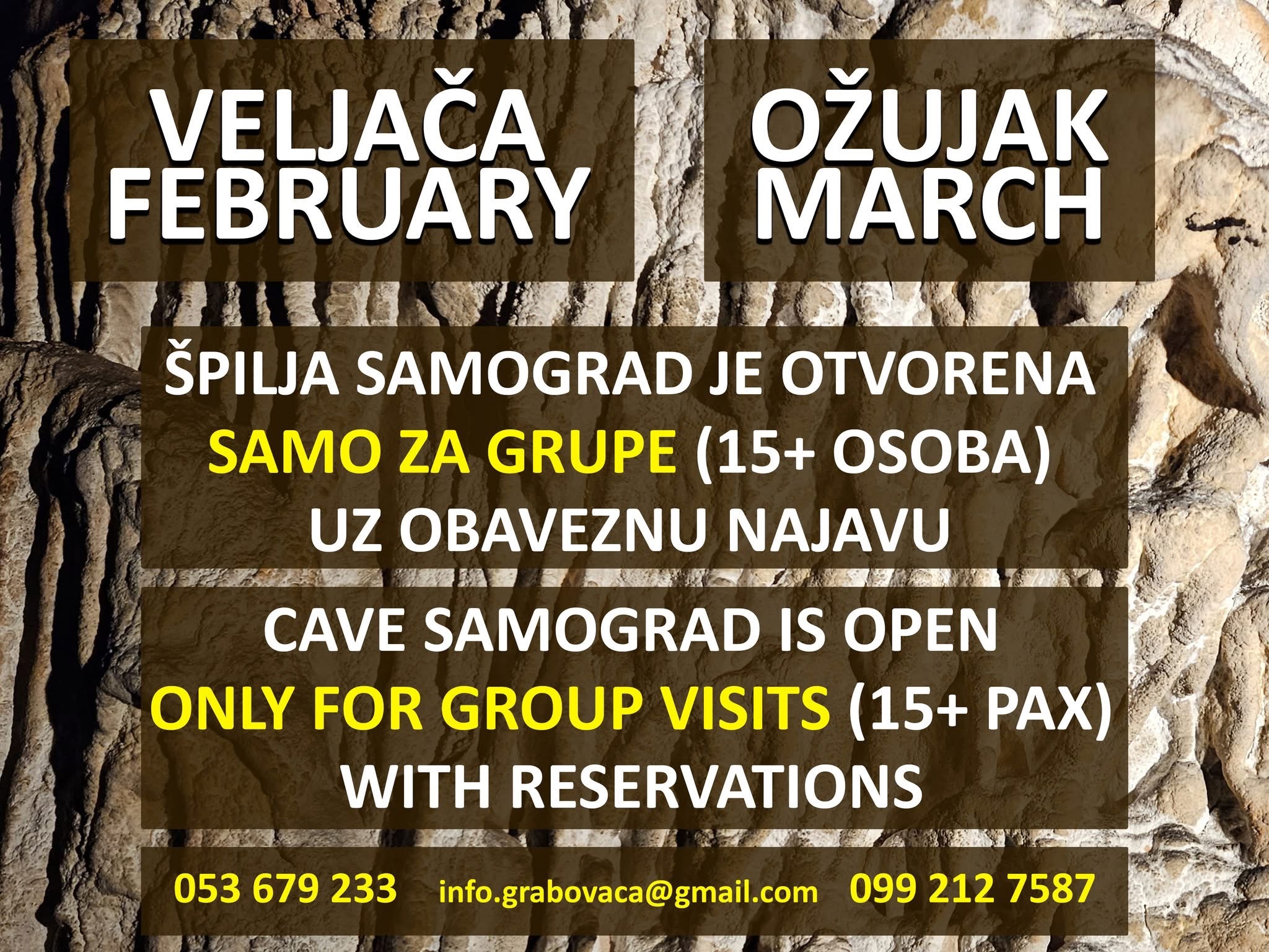 - Tijekom VELJAČE i OŽUJKA špilja Samograd je otvorena SAMO ZA GRUPE (više od 15 osoba), uz obaveznu najavu!