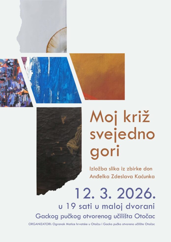 „Moj križ svejedno gori“ naziv je izložbe slika iz zbirke don Anđelka Zdeslava Kaćunka koja će 12. ožujka 2026. u 19 sati biti otvorena u Otočcu u Gackom pučkom otvorenom učilištu. Na izložbi će biti predstavljena 33 likovna djela iz zbirke koja je nastajala posljednja tri desetljeća i koja pod zajedničkom temom križa i Kristove muke okuplja djela različitih autora i raznovrsnih pristupa.