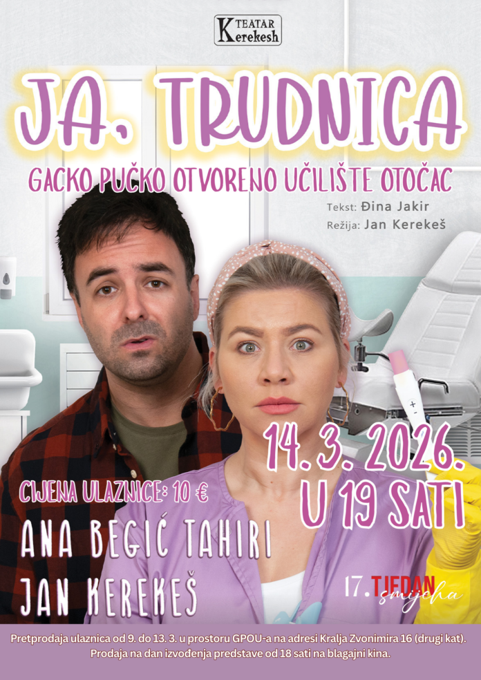 Predstava Ja, trudnica Kerekesh Teatra gostuje u Gackom pučkom otvorenom učilištu Otočac u subotu 14. ožujka 2026. godine u 19:00. Ulaznice za predstavu po cijeni od 10 € moguće je kupiti u pretprodaji od 9. do 13. 3. svakim danom od 8 do 15 sati u prostoru GPOU-a na adresi Kralja Zvonimira 16 (drugi kat) te na dan izvođenja predstave od 18:00 na blagajni kina.