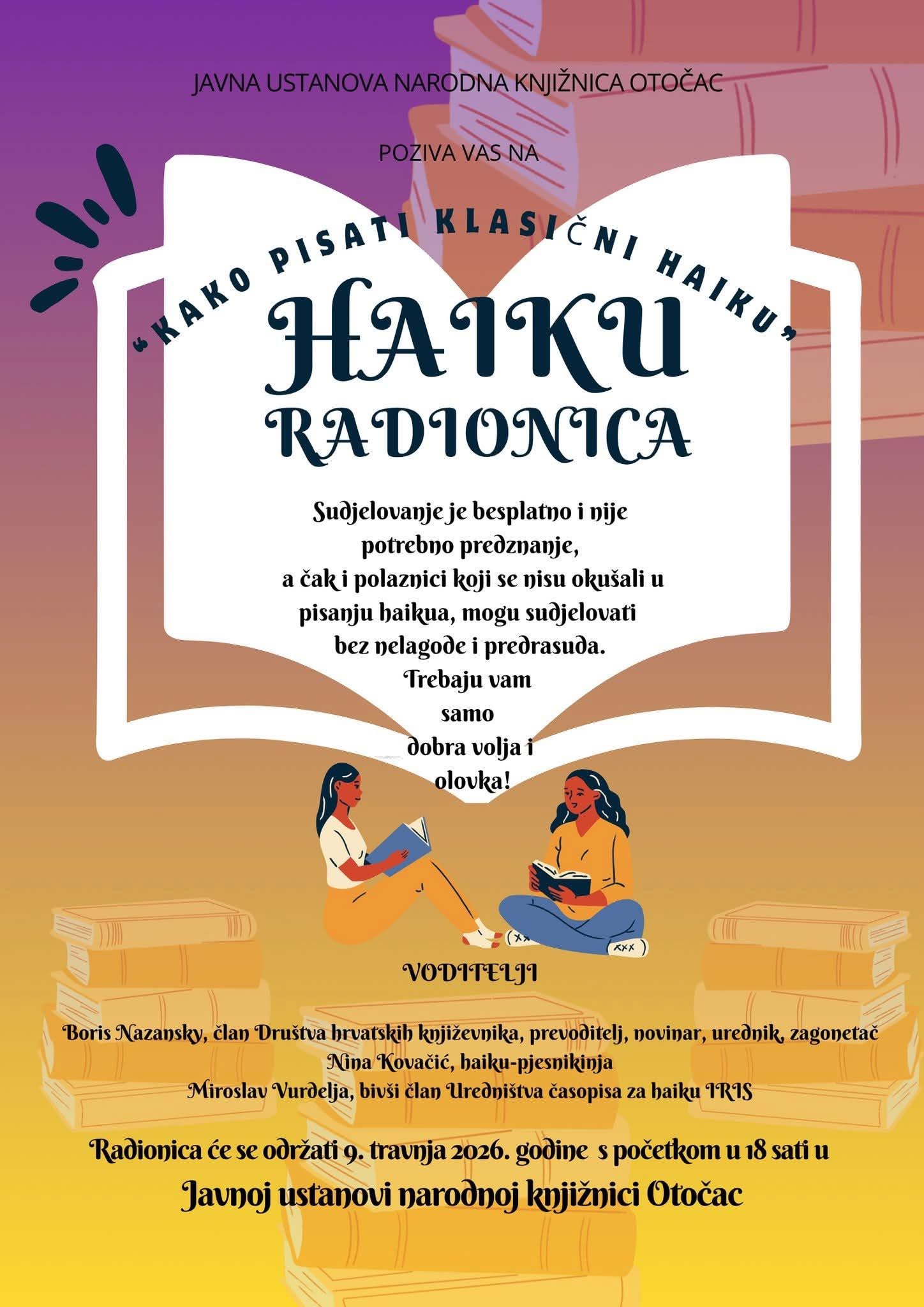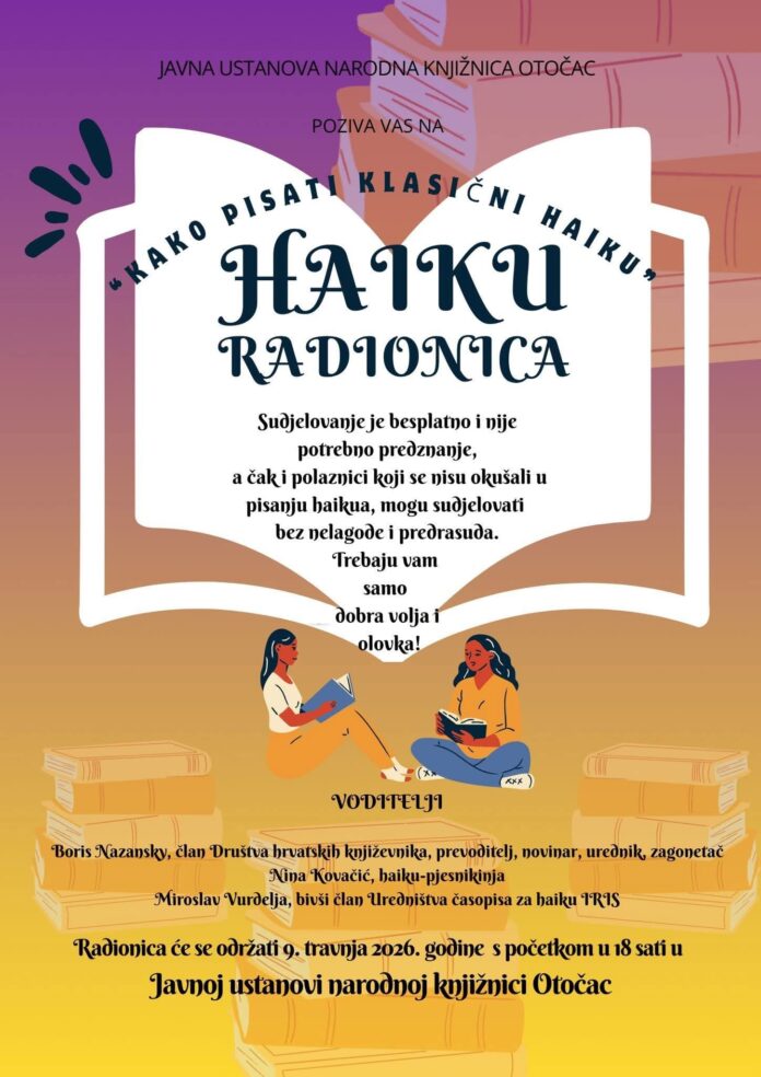 U Javnoj ustanovi Narodnoj knjižnici Otočac ljubitelji pisane riječi imat će priliku uroniti u svijet jedne od najpoznatijih japanskih pjesničkih formi. Radionica pod nazivom „Kako pisati klasični haiku“ održat će se 9. travnja 2026. godine s početkom u 18 sati, a sudjelovanje je u potpunosti besplatno.
