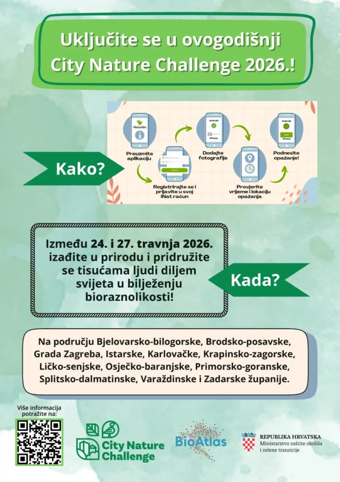 Kako se uključiti u izazov te provesti opažanja i unos divljih biljnih i životinjskih vrsta pogledajte na ovom plakatu pripremljenom od strane Zavoda za zaštitu okoliša i prirode.