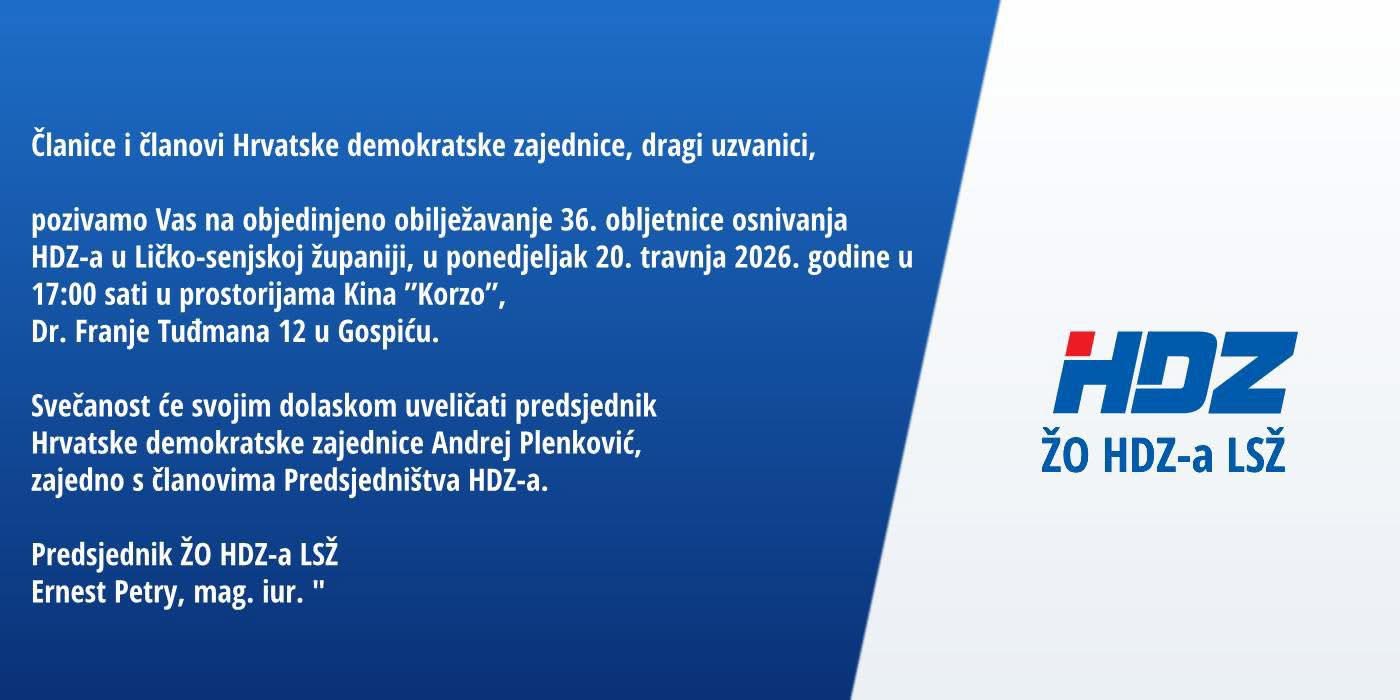 Pozivaju se članice i članovi, simpatizeri te svi građani na svečano obilježavanje 36. obljetnice osnivanja HDZ-a u Ličko-senjskoj županiji.