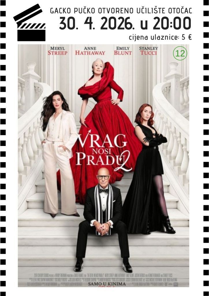 KINO | Film Vrag nosi Pradu 2 u kinu Gackog pučkog otvorenog učilišta u Otočcu bit će prikazan u četvrtak – 30. 4. 2026. – u 20 sati. Ulaznice za film moguće je kupiti sat vremena prije početka projekcije po cijeni od 5 EUR.
