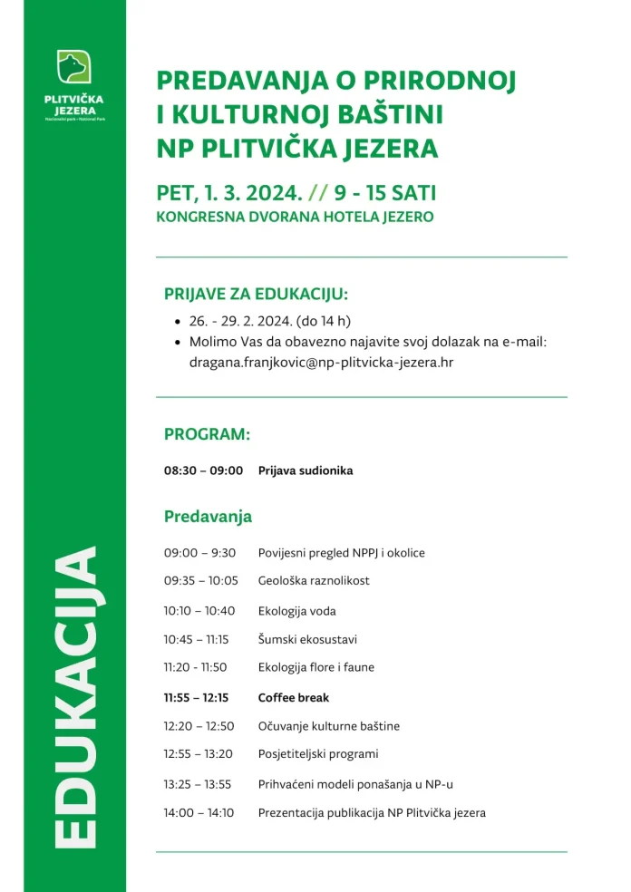 Javna ustanova Nacionalni park Plitvička jezera i ove godine organizira predavanja o prirodnoj i kulturnoj baštini Nacionalnog parka Plitvička jezera.