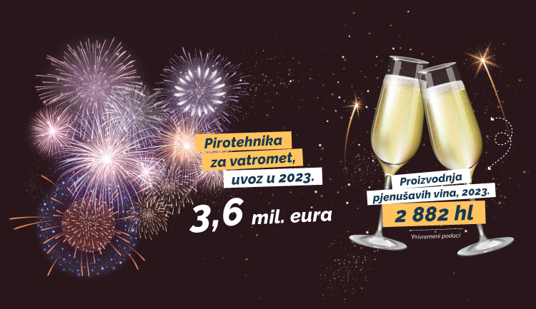 Kao posljednju postaju adventske ture, u našem slučaju začinjene statistikom, izdvojit ćemo pripreme za posljednju večer u godini. Ispraćanje starih događaja i nazdravljanje novim avanturama nezamislivo je bez pjenušavog vina, kojeg smo, prema privremenim podacima za 2023., proizveli 2 882 hektolitara. U ponoć će zasigurno mnogi pohitati na prozor kako bi vidjeli blistavi šareni spektakl na nebu. Vatromet je navodno nastao u Kini prije više od tisuću godina radi obilježavanja važnih događaja, a u 2023. uvezli smo pirotehnike za vatromet u vrijednosti od 3,6 milijuna eura. Vjerujemo da će, uz potrebne mjere opreza, i u novogodišnjoj noći izazvati osmijehe na licima.
