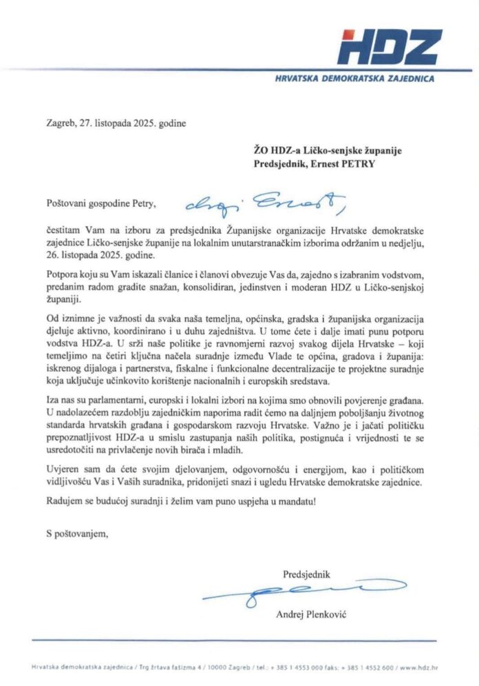 Čestitka predsjednika HDZ-a Andreja Plenkovića koju je uputio Ernestu Petryju povodom izbora na dužnost predsjednika ŽO HDZ-a Ličko-senjske županije