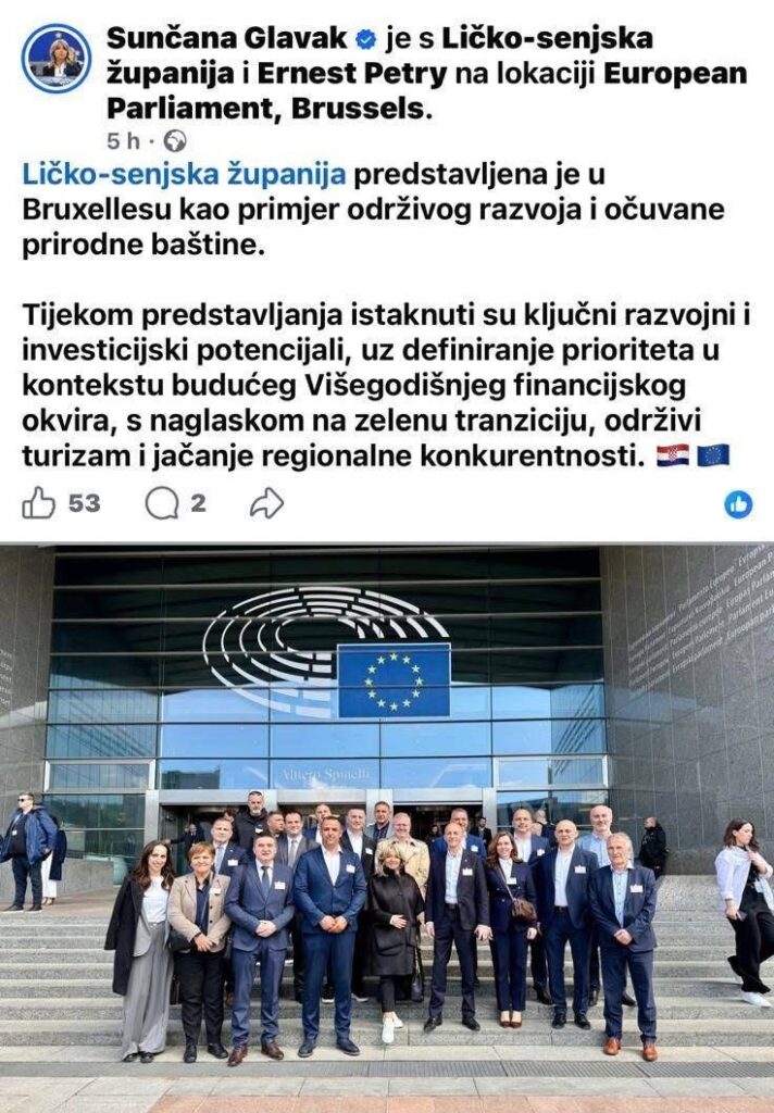 Delegacija dužnosnika iz Ličko-senjske županije iz redova HDZ-a, predvođena županom Ernestom Petryjem, boravila je u Bruxellesu, gdje je u Europskom parlamentu predstavljena kao primjer održivog razvoja i očuvane prirodne baštine.