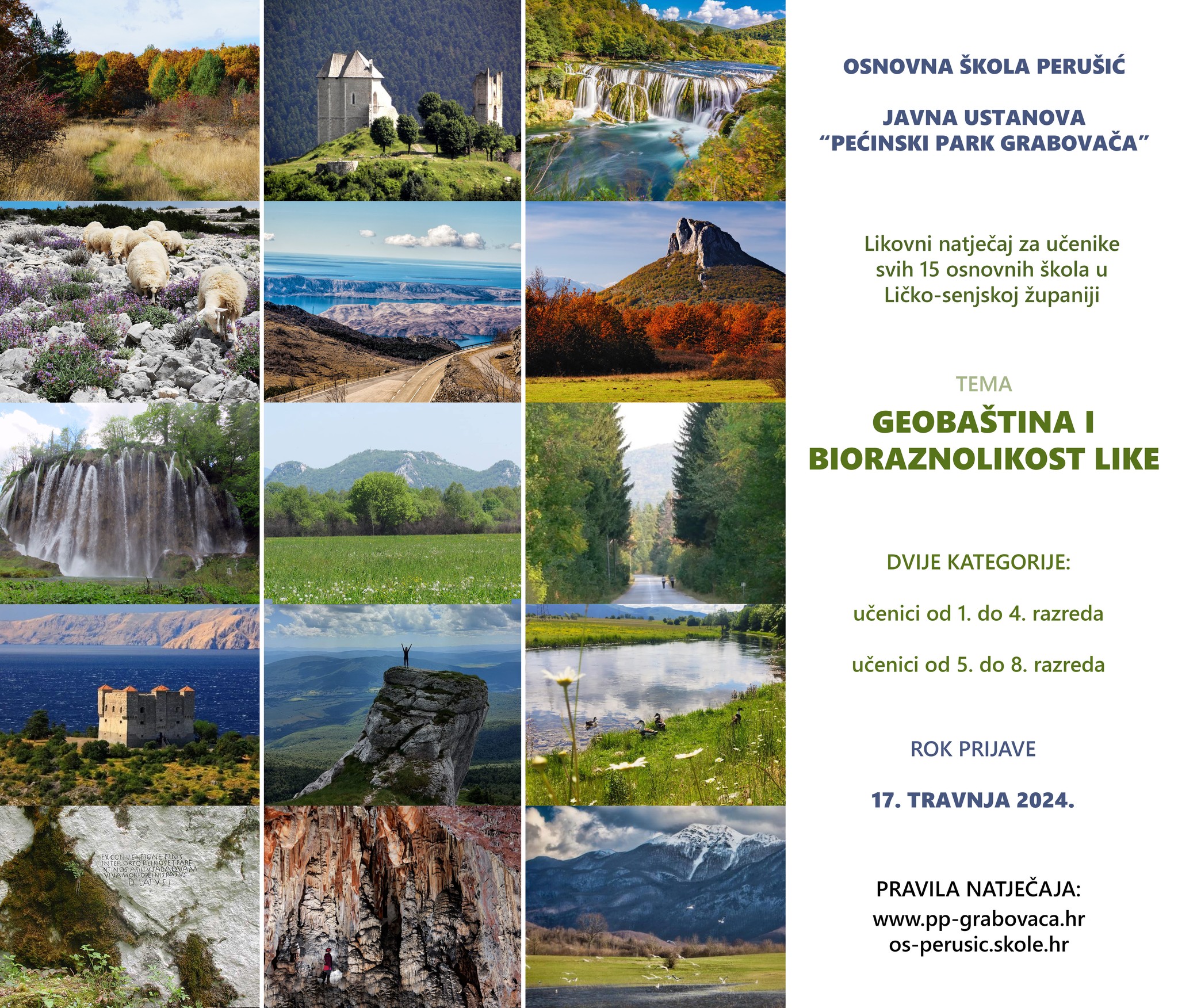 Najuspješniji radovi, podijeljeni u dvije kategorije bit će nagrađeni i javno izloženi u Pećinskom parku Grabovača. Pozivamo sve učenike i učitelje da se uključe i sudjeluju u likovnom natječaju Geobaština i bioraznolikost Like. Pravila natječaja i upute provjerite na web i Facebook stranicama Pećinskog parka Grabovača i Osnovne škole Perušić. Natječaj je otvoren do 17. travnja 2024. godine.