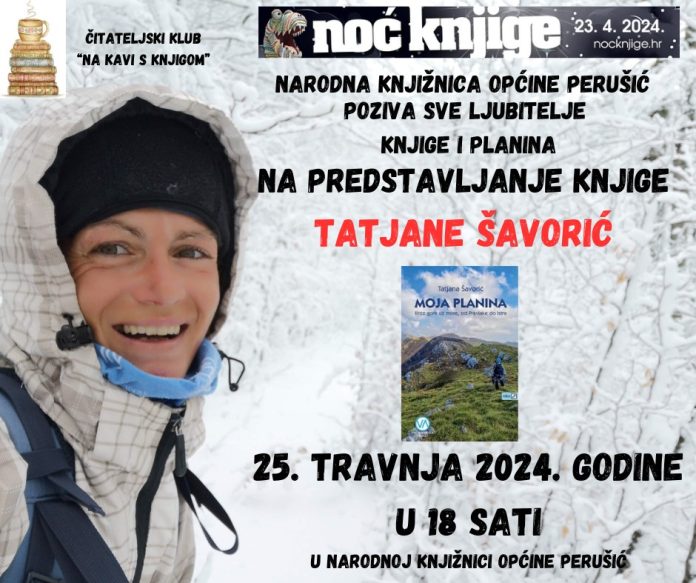Pozivamo sve ljubitelje avanture, planina i dobre knjige neka nam se pridruže na druženju s autoricom i strastvenom planinarkom Tatjanom Šavorić.