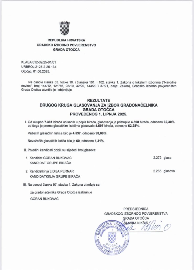 Nakon što je svih 17 biračkih odbora na području Grada Otočca Gradskom izbornom povjerenstvu po zaključenju izbora dostavilo izborne materijale i potpisane zapisnike o radu, Gradsko izborno povjerenstvo je 1. lipnja 2025. godine utvrdilo da je meni pripalo sedam glasova više u odnosu na moju protukandidatkinju i da sam time ja osvojio novi mandat za obnašanje dužnosti gradonačelnika Grada Otočca.