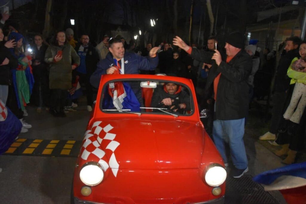 Oduševljenje i ponos osjećali su se u svakom kutku dvorane, a Pešić, vidno dirnut, s medaljom oko vrata uživao je u trenutku koji će mu zasigurno ostati urezan u sjećanje. Njegov dolazak u dvoranu bio je prava atrakcija – kroz dugački špalir baklji dovezao se u fići kabrioletu, dok su ga na Velikim vratima dočekali vatrogasci i senjska Gradska glazba.